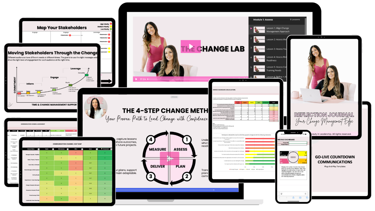 A self-paced, step-by-step change management training for women who want to confidently lead change using our proven 4-step method, complete change toolkit, reflection journal, and leadership-ready strategy deck.
